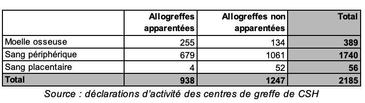 - 1 203 greffons issus de prélèvements de MO et de CSP,