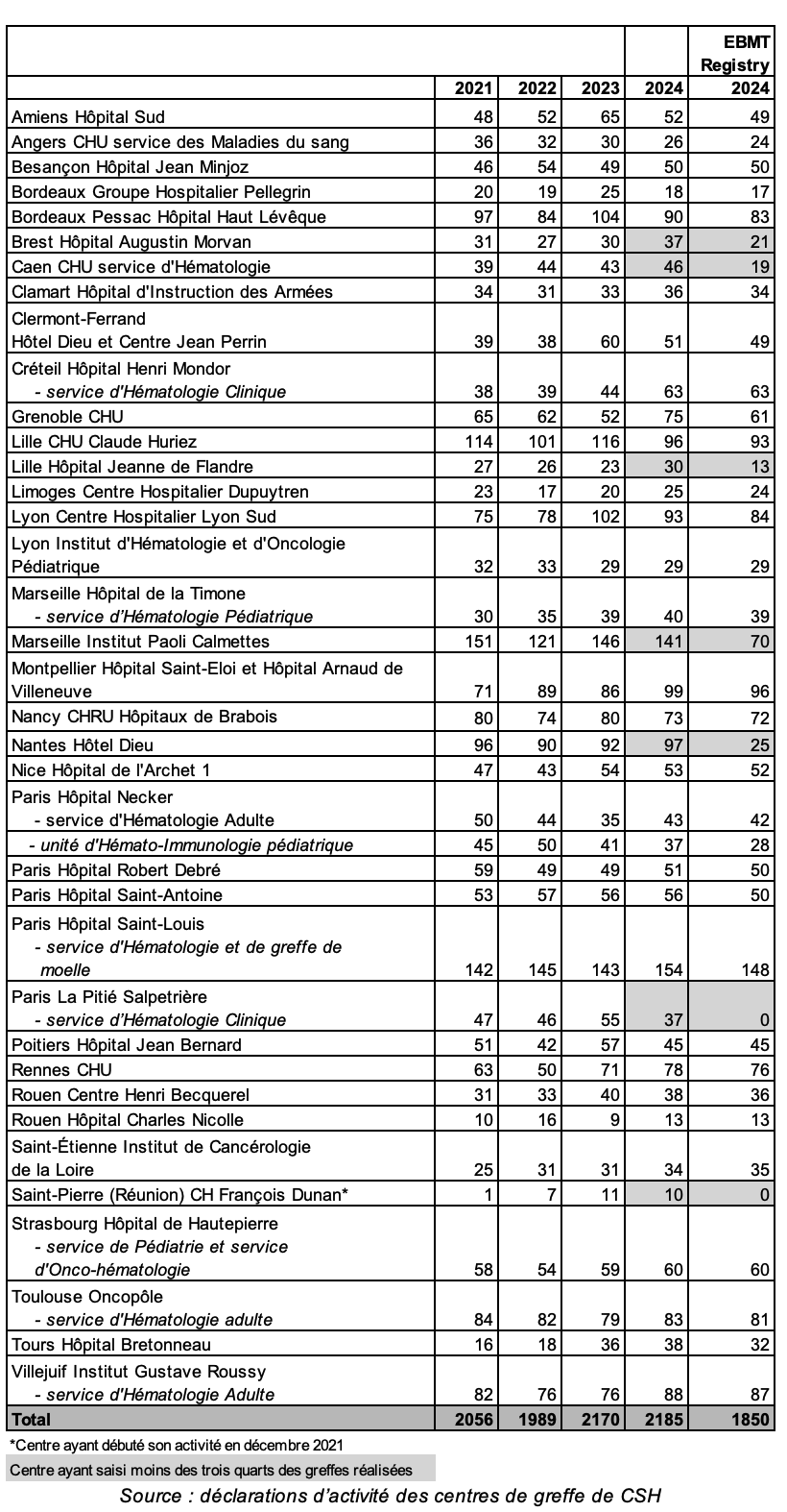 En 2024, 74 centres français ont réalisé des greffes de cellules souches hématopoïétiques (CSH). Cette activité est divisée en deux catégories : greffes allogéniques et greffes autologues. Parmi ces 74 centres, 36 n’ont réalisé que des autogreffes, 3 n’ont réalisé que des allogreffes et 35 ont eu une activité mixte.