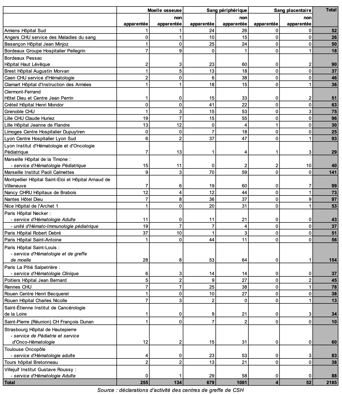 - Des informations quantitatives relatives aux greffes : le nombre total de greffes réalisées et le nombre total de patients greffés, par centre et par type de greffe (ces chiffres sont reportés dans les Tableaux CSH G2, CSH G4, CSH G5). Ces données sont obtenues par les déclarations d’activité envoyées par chaque centre de greffe.