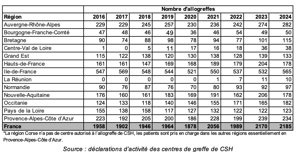 En 2024, 38 centres autorisés sur le territoire national ont réalisé un total de 2 185 allogreffes de CSH.
