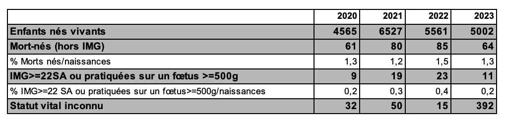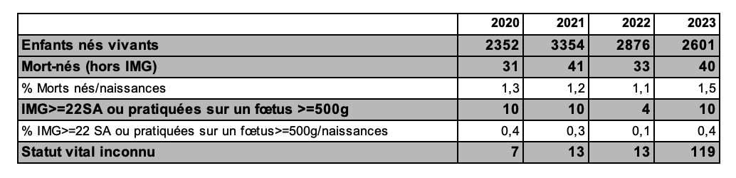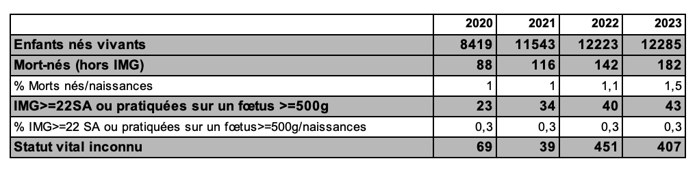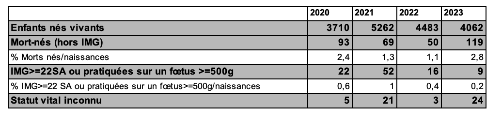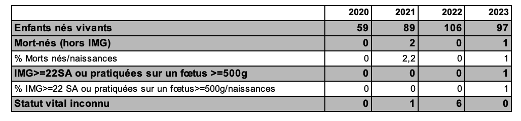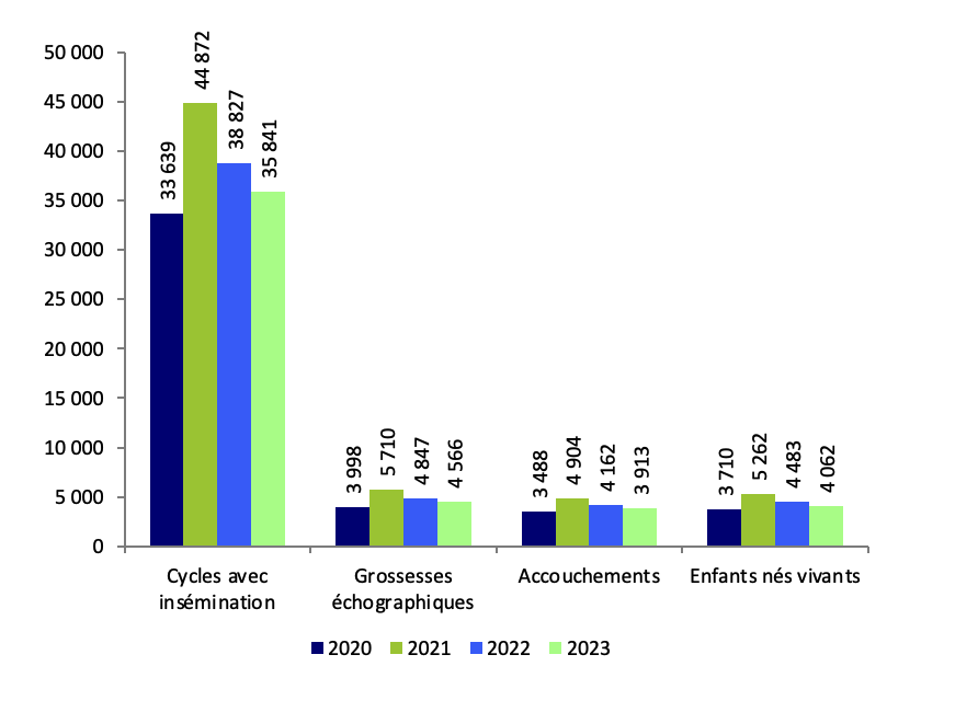 Le suivi des grossesses de 2023 montre que 10,1 % des grossesses obtenues s’interrompent au premier trimestre par une fausse couche (FC) ou une grossesse extra-utérine (GEU) (tableau AMP9), ce chiffre étant en continuelle diminution depuis 2020 (tableau AMP9). En conséquence les cycles d’insémination de 2023, ont permis la naissance de 4 062 enfants vivants.