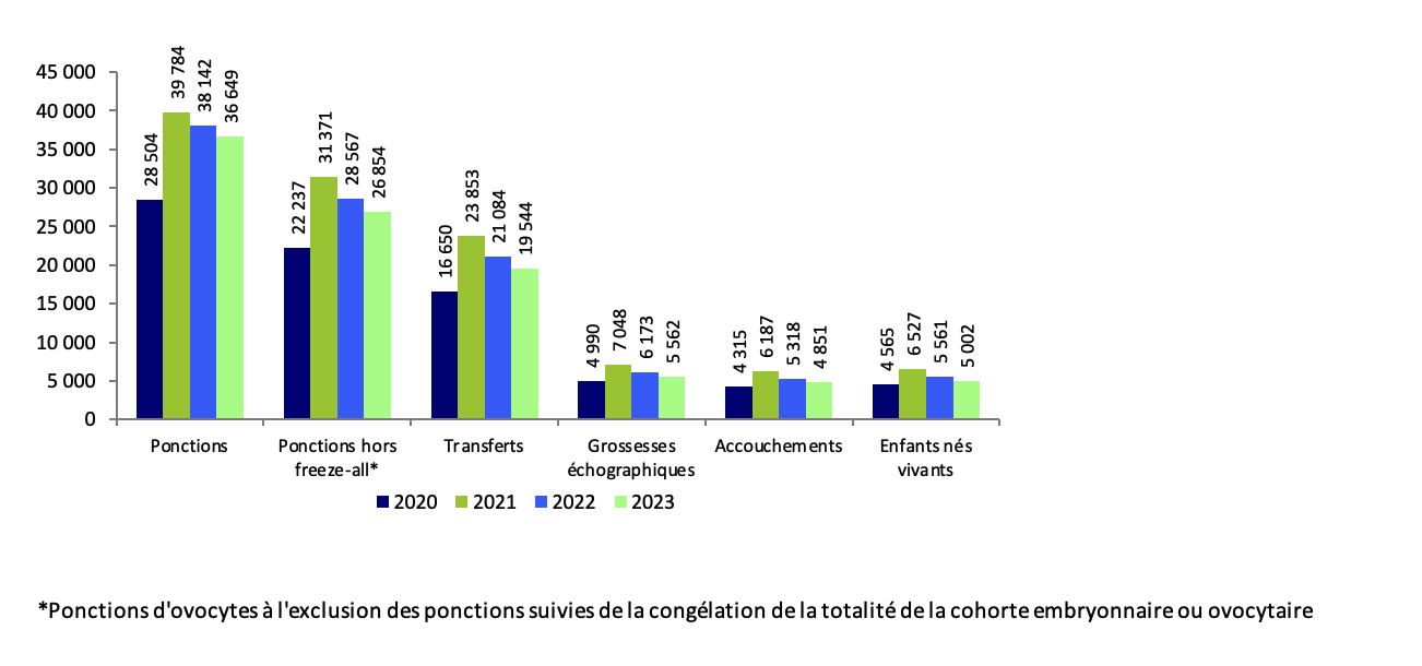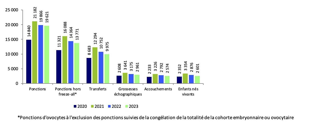 Les pratiques de transferts mono-embryonnaire étant de plus en plus privilégiées (63,9 % en 2020, 75,5 % en 2023, tableau AMP22), on observe un recours à la congélation embryonnaire de plus en plus important. La proportion de ponction suivi d’une congélation embryonnaire, quelle que soit la technique utilisée, a augmenté de 2,4 points en 2023 par rapport à 2022, atteignant alors 55,1 % des ponctions. La stratégie freeze-all (ponction suivie de la congélation de la totalité de la cohorte embryonnaire) a augmenté de 2 points entre 2022 et 2023 et est passée 21,2 % à 26 % entre 2020 et 2023 (tableau AMP19). Ces nouvelles stratégies ont contribué à diminuer le taux de grossesses multiples à 5,3 % des accouchements en 2023 contre 8,3 % en 2020 (tableau AMP19) tout en maintenant un taux d’implantation embryonnaire stable à 23,7 % (tableau AMP23). Cependant, le recours au transfert mono-embryonnaire est de plus en plus important et atteint 78,2 %, FIV et ICSI confondues, en intraconjugal en 2023, contre 65,7% en 2020.