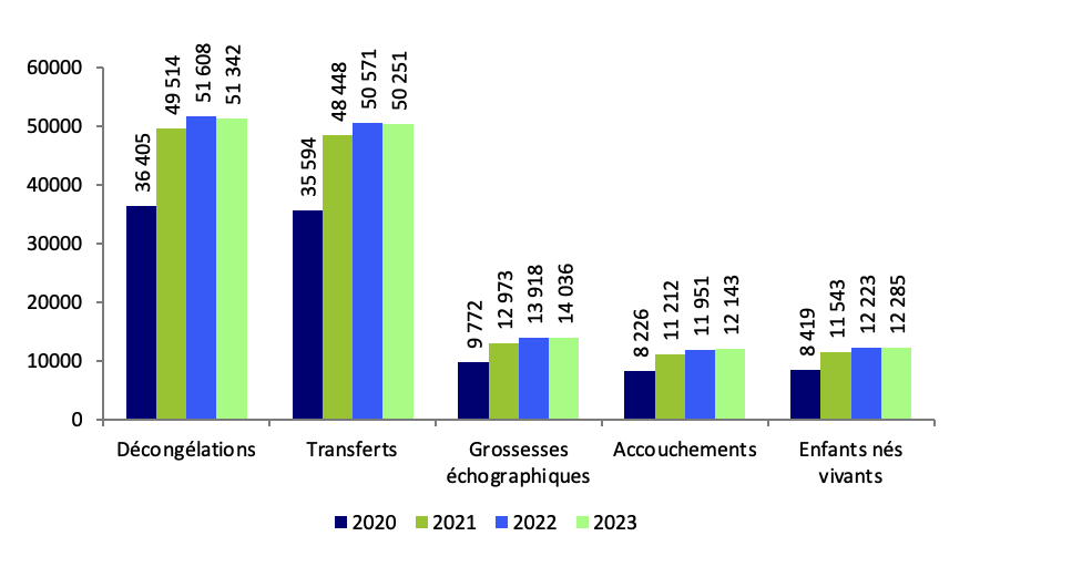 L’indicateur « accouchement par décongélation » est à 13,3 % en 2023 et suit au cours des dernières années des variations à la marge : 14,2 % en 2021 et 14,0 % en 2022.