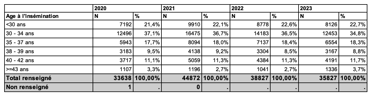 Les inséminations sont majoritairement réalisées pour des femmes de 30 à 34 ans (34,8 % en 2023), suivi des femmes de moins de 30 ans (22,7 % en 2023) puis des femmes de 35 à 37 ans (18,3 % en 2023, tableau AMP8). On observe toutefois une hausse du recours à l’insémination chez les femmes âgées de 40 à 45 ans (14,4 % en 2020 contre 15,4 % en 2023), tandis que l’utilisation de l’IIU diminue progressivement chez les femmes de 30 à 34 ans (37,1 % en 2020 contre 34,8 % en 2023), témoignant du vieillissement global des femmes à l’accouchement (INSEE). De plus, le résultat des tentatives par tranche d’âge reste globalement stable de 2020 à 2023, avec un taux d’accouchement par insémination en intraconjugal qui chute en dessous de 10 % dès 38 ans et qui atteint 2,5 % au-delà de 43 ans (Tableau AMP11).