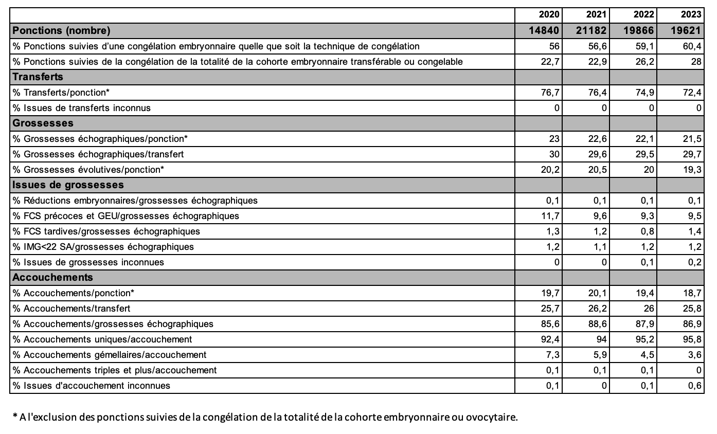 En 2023, le transfert mono-embryonnaire représente 82,82 % des transferts d’embryons frais (tableau AMP14). Ces transferts souvent sélectifs, en augmentation constante (68,91 % en 2020), ont conduit à une diminution du taux d’accouchements multiples (3,6 % en 2023 vs 7,4 en 2020, tableau AMP13). Le taux d’accouchement par ponction FIV hors ICSI baisse progressivement depuis 2021, passant de 20,1% à 19,4% puis à 18,7 % en 2023 avec néanmoins un maintien du taux d’accouchement par transfert à 25,8 % en 2023 (tableau AMP13). La diminution des taux d’accouchement par ponction est à investiguer davantage car ils suggèrent que les femmes prises en charge auraient un moins bon pronostic, ce qui pourrait être dû à l’augmentation de l’âge de prise en charge ou du recours plus fréquent au freeze-all pour les femmes jeunes dont les résultats se retrouvent ainsi exclus du taux d’accouchement par ponction. Cependant, lorsqu’on analyse les taux de grossesse cumulés, ils augmentent chaque année et étaient de 30 % en 2022 (Rapport d’évaluation national).