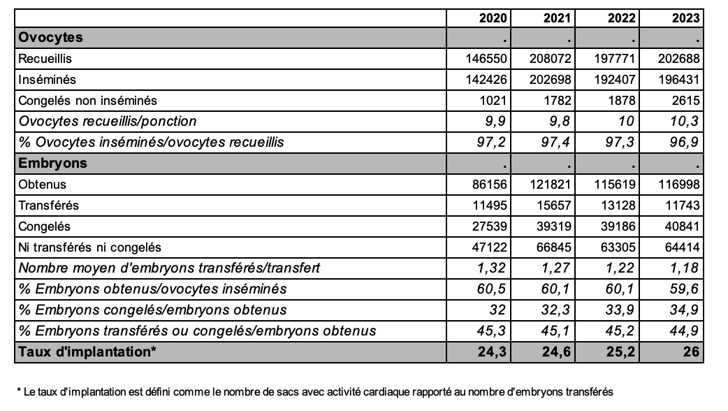 Le taux d’implantation par embryon transféré se stabilise à 17,6 % en 2023 (tableau AMP30) mais reste inférieur à celui des embryons obtenus à partir d’ovocytes frais (26 % et 23,7 % respectivement en FIV et en ICSI intraconjugal) et la possibilité d’un transfert n’est pas garantie, seules 71,3 % des tentatives de décongélations ovocytaires aboutissent à la réalisation du transfert d’au moins un embryon avec une moyenne d’ovocytes décongelés de 6,4 par tentative (tableau AMP28, tableau AMP30).