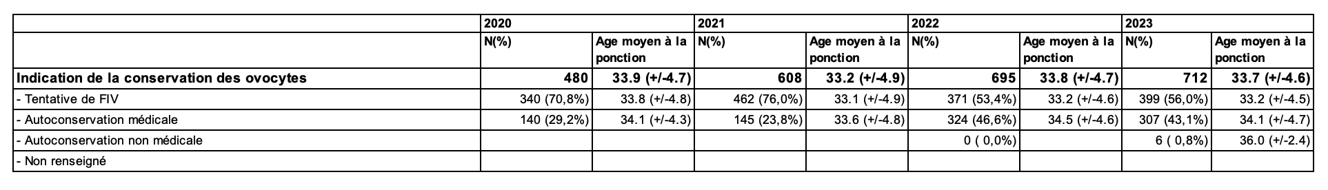 Cette partie présente des indicateurs sur les tentatives de fécondation in vitro réalisées à partir de cohorte d’ovocytes réchauffés pendant la prise en charge en AMP, quelle que soit l’indication de la vitrification des ovocytes et le moment auquel ils ont été vitrifiés.